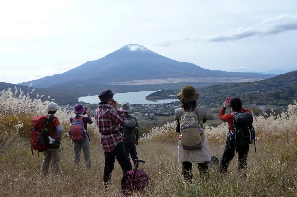 パノラマ台からは 黄金色に輝くススキ原を登ります、着いた明神山はススキの名所で、眼下に山中湖、富士山、南アルプスを眺めながら多くの登山者がくつろいでいました。